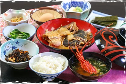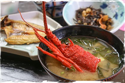 伊勢エビお造り付のコースの方は、朝食に贅沢一品〝伊勢エビの味噌汁〟をお付けいたします。